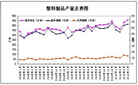 2010年4月國內(nèi)塑料制品總產(chǎn)量為456.4萬噸,較去年同期增加25.9%,2010年1-4月份國內(nèi)塑料制品累計總產(chǎn)量在1581.4萬噸,較2009年同期增長23.2%。